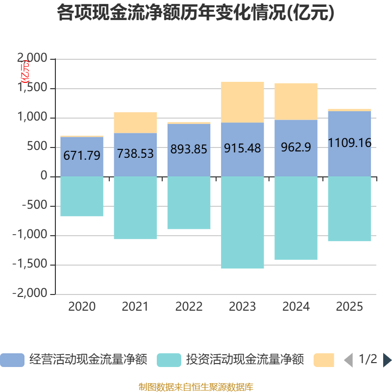 收尾2025年,公司运筹帷幄行径现款流净额为1109.16亿元,同比增长15.19%;筹资行径现款流净额37.39亿元,同比减少582.9亿元;投资行径现款流净额-1101.16亿元,上年同时为-1417.71亿元。